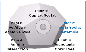 En esencia, nuestra propuesta consiste en un modelo pentagonal para el cambio social, a través del diseño e implementación de políticas públicas, relacionando los vértices conceptuales que definen la arquitectura de nuestro Libro-red SAI. Lo hemos llamado: “Modelo de la Acción Socio-sistémica”, porque describe cómo un agente social (Pilar 4: el actor y sus interacciones) cumple una acción social (Pilar 5: política y acción cívica) para crear un recurso social (Pilar 1: capital social), utilizando para ello un marco sistémico (Pilar 2: teoría social de Niklas Luhmann) y una herramienta sistémica poderosa y eficaz (Pilar 3: tecnología social adaptativa e inteligente, SAI).